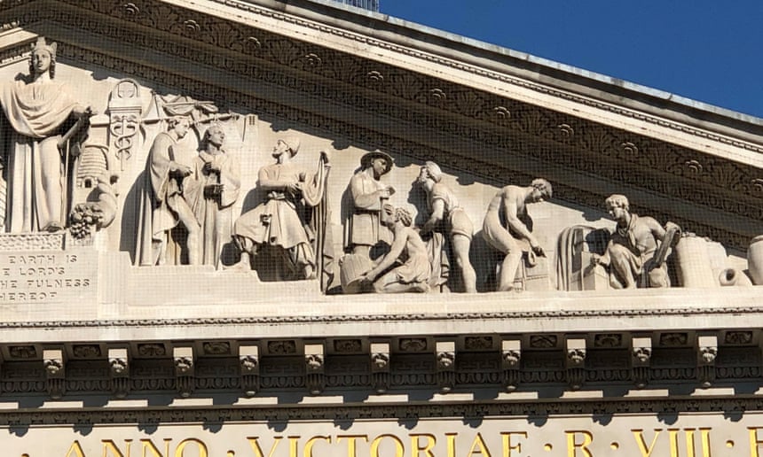 Look closely at the pediment of the Royal Exchange, and you see an African enslaved man kneeling in a tableau of imperial commerce – carved more than 30 years after the slave trade had been abolished.