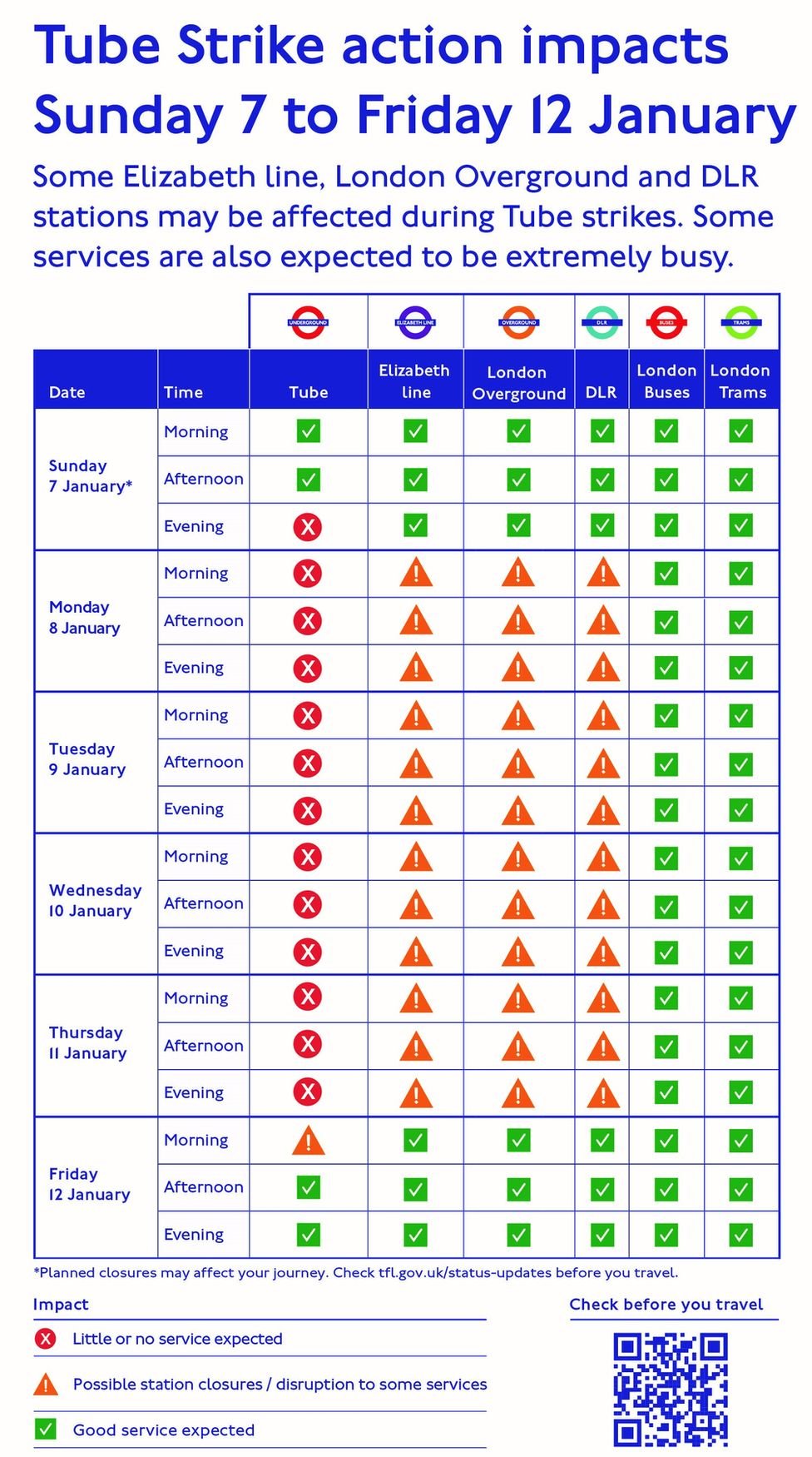 The RMT union announced on Friday that their efforts to settle the pay dispute were unsuccessful, leading to walkouts planned from January 5 to January 12. However, significant disruptions are expected to start on the evening of Sunday, January 7, as Tube services begin to decrease, continuing heavily from Monday through Thursday.