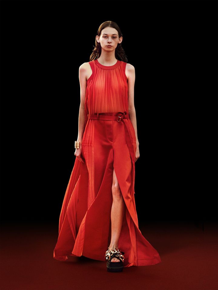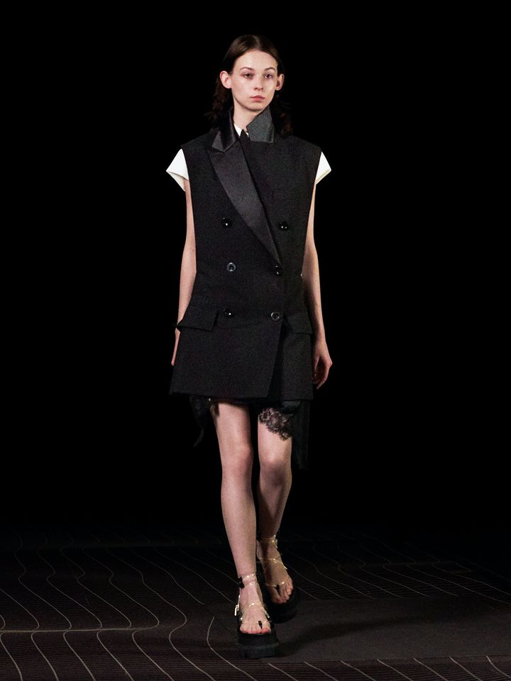 Chitose Abe continues its hybridization path with Sacai, presenting the Spring/Summer 2022 women's collection. A fusion of different aesthetics, formalwear joins sportswear, nightwear with daywear. The traditional wardrobe is reinterpreted-the jacket integrates with the shirt, the pleated skirt lengthens to become a long dress, while the sleeveless blazers lengthen and become mini dresses.