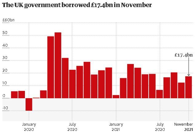 Significant borrowing has continued in 2021, with £136bn borrowed between April and November, with the vaccine and test-and-trace programmes adding to costs, according to data published by the Office for National Statistics (ONS). That was the second highest since records began in 1993.